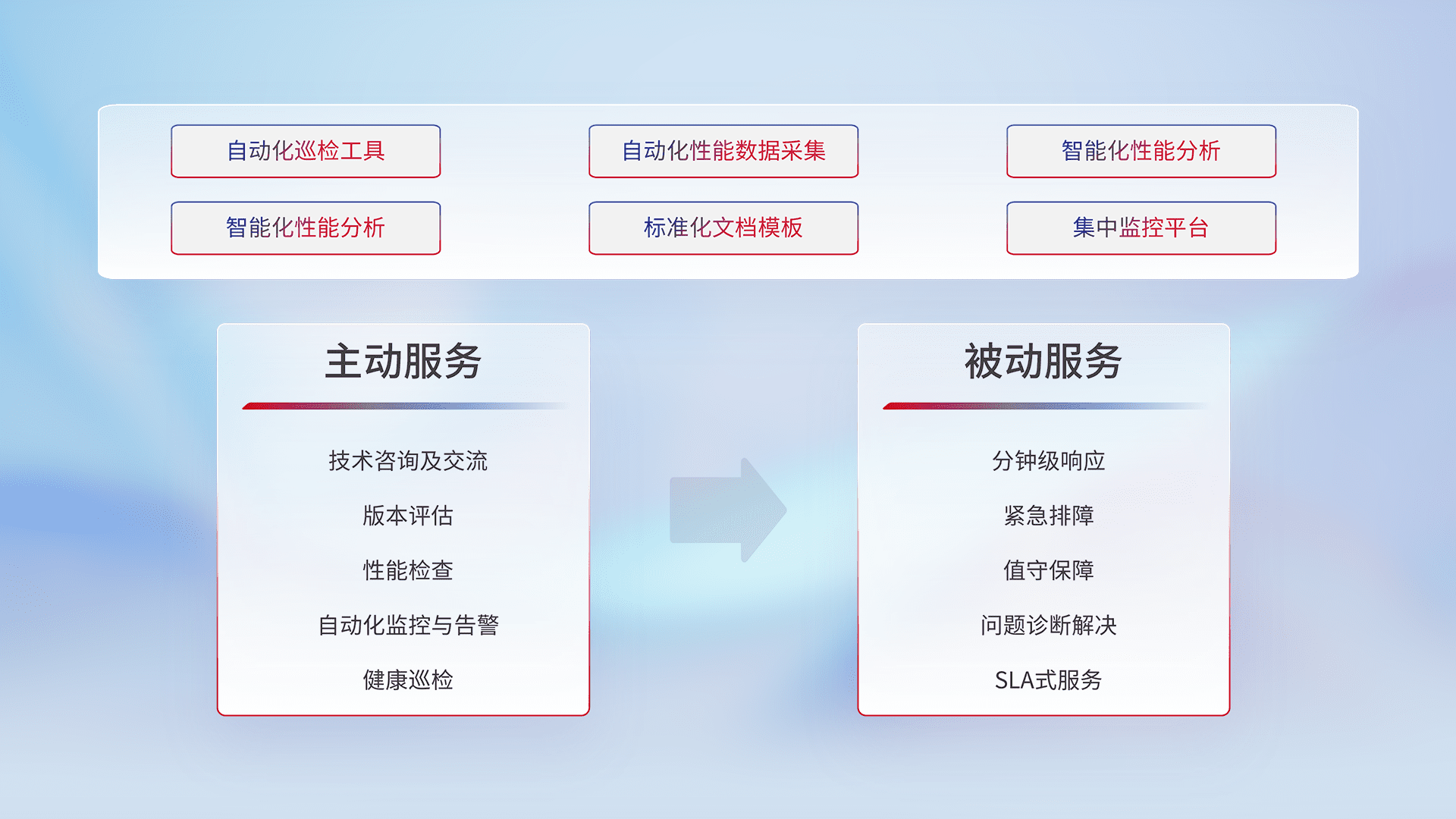 智能化工具和标准化文档,,保障服务质量,,,,提供主动服务(包含技术咨询、、版本评估、、、性能检查、、、自动化监控与告警、、健康巡检)和被动服务包含(分钟级响应、、、、紧急排障、、、、值守保障、、、、问题诊断解决、、、、SLA服务)。。
